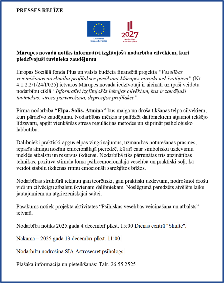 Skultes iedzīvotāji! Aicinām nebaidieties meklēt palīdzību, ja kādā brīdī ir grūti! Ikvienam, kam nepieciešams psihoemocionāls atbalsts vai pārrunāt sarežģītus dzīves jautājumus, meklējot risinājumu, ir iespēja atnākt uz “Sarunu divatā” pie sociālā darbinieka. Lūdzam iepriekš pieteikties pa tālr. 67806599, 27851877 vai personīgi pie dienas centra “Skulte” darbiniekiem. Konfidencialitāte garantēta!